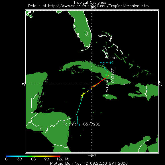 A 00H00 GMT vendredi, le centre de Paloma se trouvait à 270 km au sud de l'île de Grand Cayman et 450 km à l'ouest de Montego Bay, en Jamaïque. La tempête se déplace vers le nord à une vitesse de 19 km/h avec des vents de 120 km/h et des rafales plus fortes.