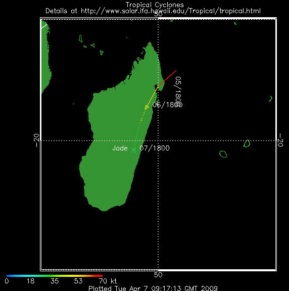 Jade va pénétrer d'ici quelques heures dans le nord-est de Madagascar juste au sud de la ville de Antalaha, elle devrait apporter de fortes pluies qui sont susceptibles de générer d'importantes inondations.