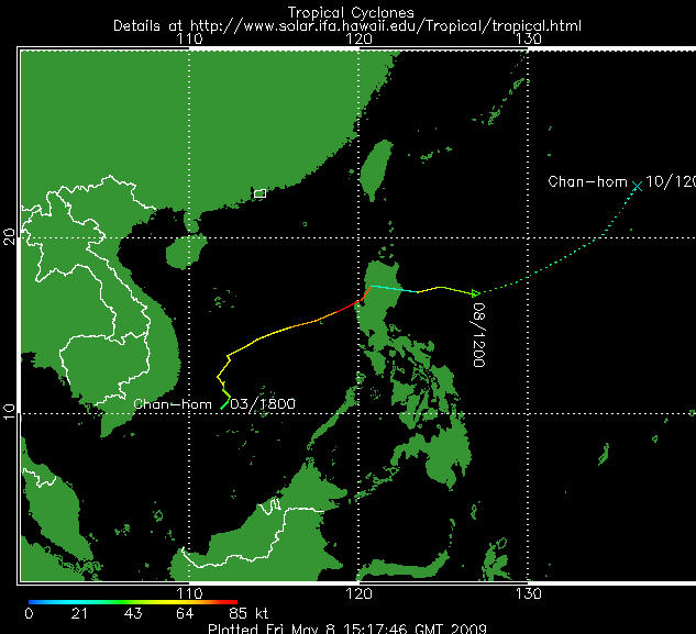 La tempête tropicale Chan-Hom s'est formée au cours des dernières heures au large des côtes Sud-Ouest des Philippines et se dirige vers l'île principale de l'archipel, Luzon déjà affectée ce week-end par la tempête tropicale Kujira. Chan-Hom se déplace vers le nord-nord-est à une vitesse de 6 noeuds, le vent moyen maximal atteint 75km/h, les rafales maximales les 90km/h.