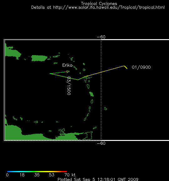 03/09 : La Martinique, la Guadeloupe, Saint-Barthélémy et Saint Martin sont en vigilance orange pour la tempête tropicale ERIKA . Cette tempète tropicale est un systeme toujours mal organisé, mais elle maintient toujours de mauvaises conditions météorologique sur l'archipel. Des orages provoqueront encore des fortes rafales de vent, ainsi que des précipitations de forte intensité.