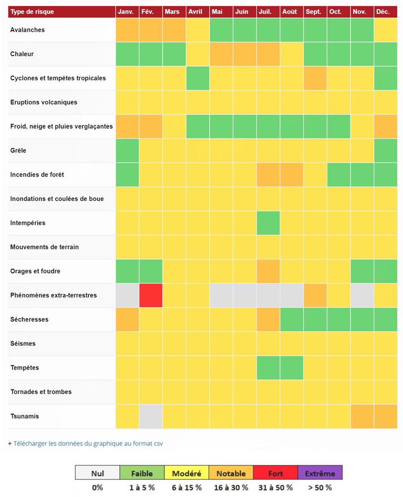 L'almanach des risques naturels permet de visualiser de manière synthétique, pour chaque mois, le niveau d'exposition aux différents aléas naturels pour l'ensemble du monde, pour un continent ou un pays donné. Cette rubrique est réservée aux personnes disposant d'un abonnement Premium ou personnalisé à notre site.