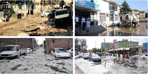 La ville d’Izmir et ses abords (Nord-Ouest de la Turquie) a été frappée par une crue éclair causée par de fortes pluies qui ont duré environ 30 minutes. Il est tombé 168 mm de pkuie en 24h un record. Les rues se sont transformées en rivière. Des centaines de rez de chaussée d'habitations et de commerces ont été inondés.