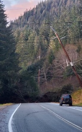 Un glissement de terrain à environ 8 km au sud de Petersburg en Colombie-Britannique a provoqué une panne de courant, avec des lignes téléphoniques et Internet également dans certaines parties de la ville.
