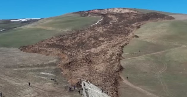Un glissement de terrain massif, englobant environ 1,3 million de mètres cubes  de terre, a frappé le village de Karl-Marx dans la municipalité rurale de Jalpak-Tash, à Uzgen, au Kirghizistan.