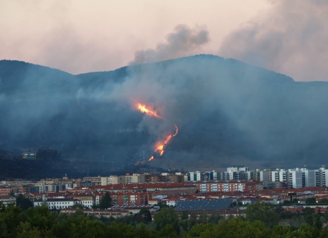 Environ 70 membres des pompiers de Navarre / Nafarroako Suhiltzaileak travaillent pour limiter l'incendie qui s'est déclaré cet après-midi vers 16h50 sur le versant sud du mont Ezkaba, également connu sous le nom de San Cristóbal, au nord de Pampelune.