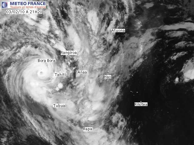 04/02 @ 21:00 : Après être passé au large de Tahiti le cyclone Oli poursuit sa progression vers le sud de l’archipel polynésien, gagnant en puissance tout en s’éloignant des zones les plus peuplées.
