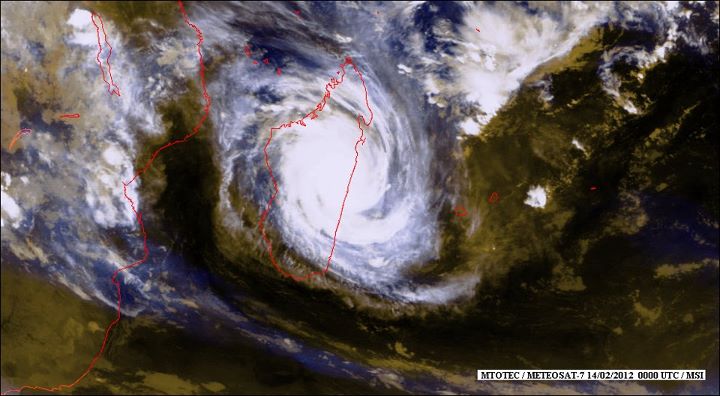 18/02 : Giovanna après avoir concerné le canal du Mozambique en milieu de semaine, s'est à nouveau renforcé pour devenir un cyclone de catégorie 1, ce qui est tout à fait exceptionnel car il se situe dans une zone où l'eau est plus froide, et donc moins favorable au renforcement de ce type de phénomène. Le sud de Madagascar est donc touché à son tour par de fortes intempéries, de moindre ampleur que celles survenues lundi et mardi sur le centre de l'île.