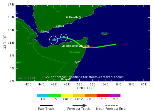 Le cyclone tropical "Gati" a touché terre le cap Hafun, Puntland, Somalie vers 15h00 UTC le 22 novembre 2020, avec une vitesse de vent moyenne maximale sur 3 minutes de 130-140 km / h  - Tempête cyclonique très sévère / équivalent à un ouragan de catégorie 2 sur l'échelle de Saffir-Simpson.