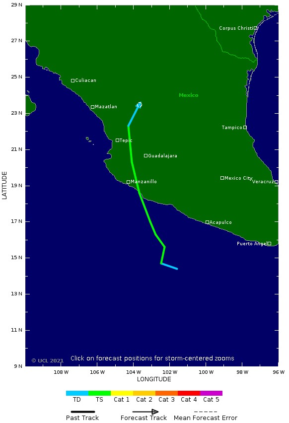 La tempête tropicale "Dolores" - la 4 e tempête nommée de la saison des ouragans du Pacifique 2021 - a touché terre juste au nord-ouest de la ville de Punda San Telmo, près de la frontière des États mexicains de Colima et Michoacán, avec des vents maximums soutenus de 115 km/h et une pression centrale minimale de 990 hPa.