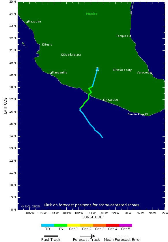 La tempête tropicale Max a frappé la côte sud du Pacifique du Mexique. Max a touché terre à environ 47 km à l’est de la station balnéaire de Zihuatanejo avec des vents d’environ 96 km/h et se déplaçait à l’intérieur des terres à environ 7 km / h).