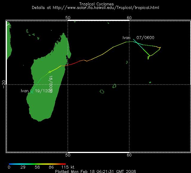Le cyclone de catégorie 3 Ivan, accompagné de vents soufflant à 230km/h en rafale, a touché le N-E de Madagascar où il a fait une dizaine de victimes. Après avoir dévasté la petite île touristique de Sainte-Marie, le cyclone a touché les côtes orientales de Madagascar au niveau de Fénérive Est et fonce vers les hautes terres centrales en direction de la capitale et d’Ambatondrazaka, l’un des greniers à riz du pays.