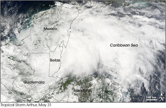 La tempête tropicale Arthur a touché le Belize et le Guatemala. Arthur a été accompagnée par de très fortes précipitations atteignant 350 mm dans les zones montagneuses et de l'ordre de 100 à 150 mm dans les régions de plaine.