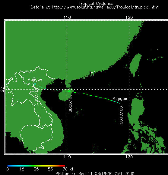 10 et 11/09 : La tempête tropicale Mujigae touché l'île de Hainan, au sud de la Chine, y apportant des précipitations sensibles à Wenchang et à Haikou, la capitale de la province.