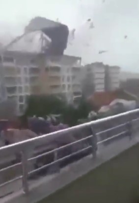 Un puissant front de rafale marquant l'arrivée brutale d'une tempête de sable et de poussière en provenance de Syrie a emporté la toiture d'un immeuble du quartier d'Afsin dans la ville Turque de Kahramanmaraş.