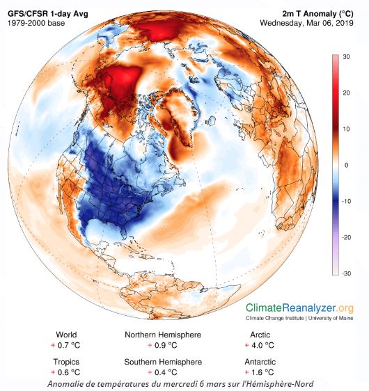 L’Amérique du Nord (ou quelques parties comme le Canada, le Québec et le nord et l’est des États-Unis) connaît une vague de froid exceptionnelle pour un début mars. En effet, une faible activité dépressionnaire a permis aux hautes pressions de regonfler sur l’ouest du Canada dirigeant une partie du vortex polaire vers le Québec et les États-Unis.