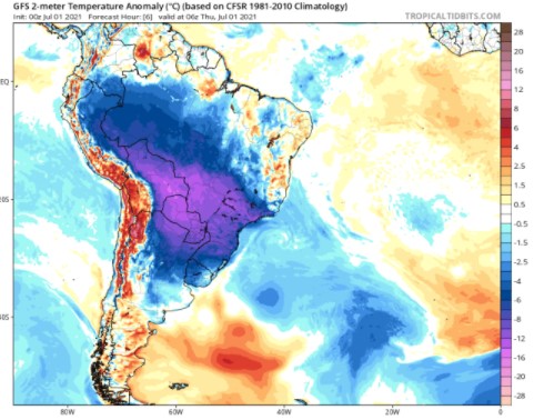 Au Brésil, l'une des masses d'air polaire les plus fortes de ces dernières années commence à faire baisser les températures dans le Rio Grande do Sul. Ces températures très basses ont causé d'importants dommages agricoles dans plusieurs états du Sud et Centre Sud-Ouest du pays.