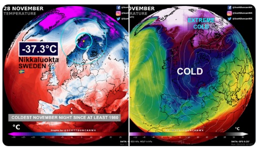 07/12: Une vague de froid historique affecte la Scandinavie, apportant des températures inhabituellement froides pour la période de l'année. Avec une température de -43,8 ° C enregistré dans Naimakka dans le nord de la Laponie, le lundi 6 Décembre, 2021, la Suède a enregistré son jour le plus froid depuis le 1er Décembre Décembre 1986