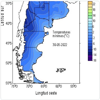 01/06: L'Argentine connaît des températures inférieures à zéro dans plusieurs provinces du pays. Selon les données du National Weather Service (SMN), les minimums les plus bas étaient de -15,0 ºC à Maquinchao, -12,6 ºC à Chapelco, -9,0 ºC à Esquel, -8,7 ºC à Victorica, -8,3 ºC à Bariloche, 7,8 ºC à Neuquén, -7,2 ºC à Uspallata, -7,0 ºC à Bolsón, -6,7 ºC à Santa Rosa et -6,6 ºC à Junín.