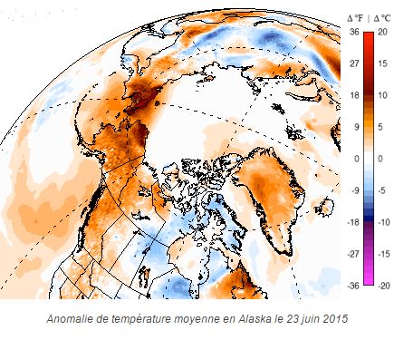Après avoir enregistré son mois de mai le plus chaud (+3,1 degrés par rapport à la normale 1981-2010) depuis le début des relevés en 1918, l'Alaska connaît depuis dimanche 14 juin une vague de chaleur marquée. La température est ainsi montée lundi 15 jusqu'à 31,7°C à Talkeetna, 31°C à Dillingham.