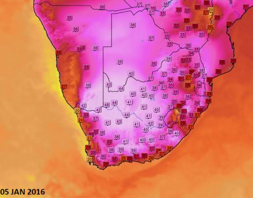 06 au 09/01 : alors que l'Afrique du Sud continue de connaitre des températures caniculaires, le Botswana et la Namibie sont eux aussi confronté à de fortes chaleurs avec des températures qui dépassent les 40°C. On a même atteint des température de plus de 48°C à Augrabies.