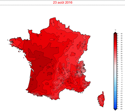 27/08: La journée de ce samedi 27 août a été la plus chaude à l'échelle nationale avec des températures supérieures à 35°C du sud-ouest au nord-est. La superficie couverte par des températures supérieures au seuil de fortes chaleurs (35°C) est remarquable, encore plus pour cette période de l'année.