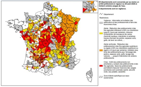 29/08: L'épisode de sécheresse se poursuit en France. En date du 28 août 2020, 80 départements sont soumis à une ou plusieurs restrictions. 179 arrêtés préfectoraux sont actuellement en vigueur pour limiter la consommation d'eau.