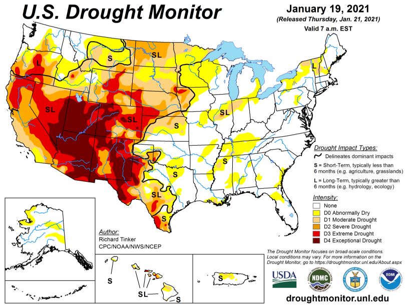 Une sécheresse modérée à exceptionnelle couvre 40,2% des États-Unis, y compris Porto Rico. Les températures de l'air chaudes et les chutes de neige minimales au printemps ont préparé le terrain pour la sécheresse qui progresse.