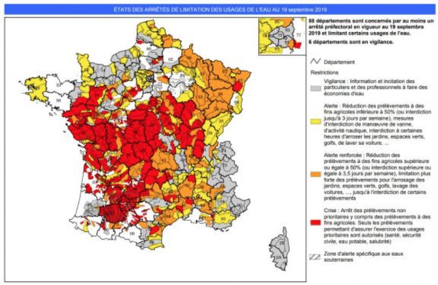 30/08: La canicule passée, la sécheresse qui touche l’Hexagone depuis le mois de juin se poursuit. 94 départements sont placés en vigilance ou en alerte, dont 87 sont actuellement concernés par les restrictions d’eau, selon le site gouvernemental Propulvia.