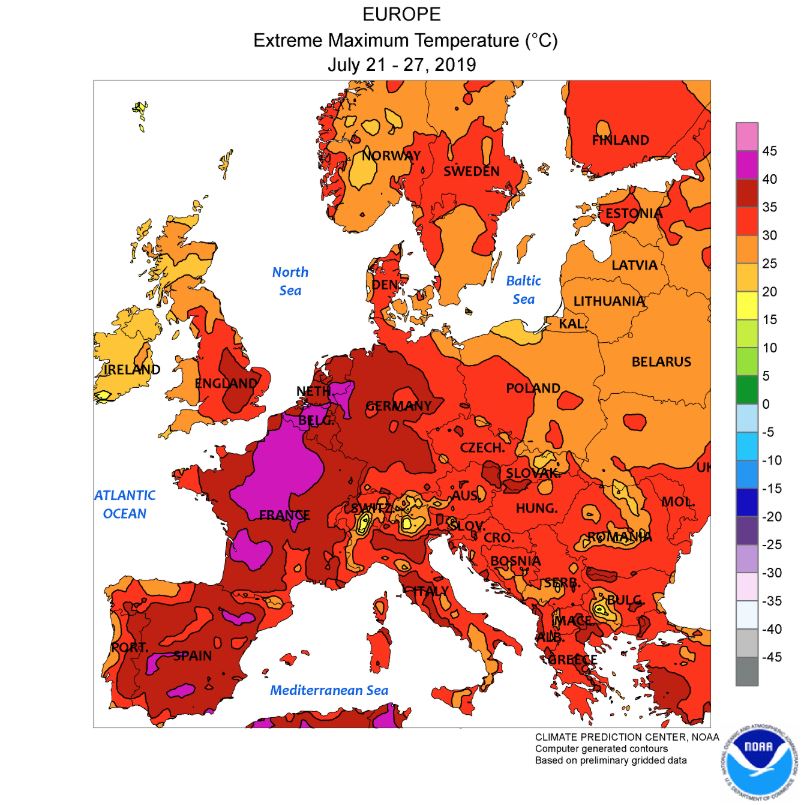 27/07 : Les pays nordiques enregistrent des températures accablantes en raison du déplacement vers le Nord de la canicule historique qui frappe l'Europe, créant dans certaines zones des «nuits tropicales».