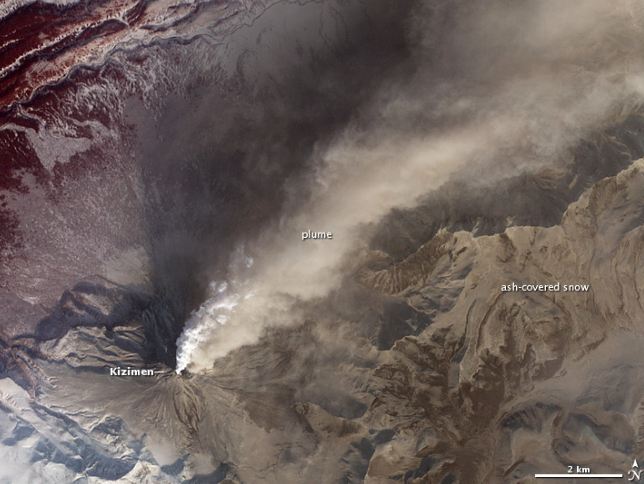 Kizimen est à l'heure actuelle l'un des volcans les plus actifs de la presqu'île. Il est haut de 2,5 kilomètres et est situé à 265 kilomètres au nord de Petropavlovsk-Kamtchatski (chef-lieu de la région). Il fait partie des 29 volcans en activité de la péninsule. La dernière fois, il est entré en éruption en 1928 et 1929, avant de se réveiller de nouveau en 2009. Une activité sismique marquée a commencé à être enregistrée dans le secteur en été dernier. Le volcan est entré en éruption à l'automne et est resté en activité tout le mois de janvier. Il a éjecté des cendres à une altitude de 10 kilomètres.