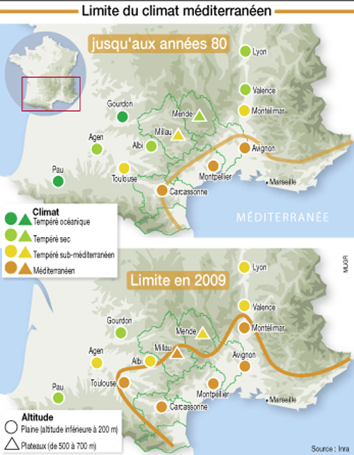 Une étude sur trente ans menée par L'Inra (Institut Nationale de Récherche Agronomique) montre que le réchauffement globale a fait progressé l'extension du climat méditerranéen.