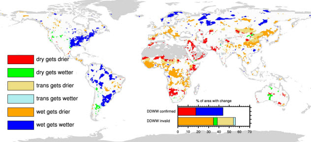 Selon des chercheurs de l'EPFZ, l'Ecole polytechnique fédérale de Zurich, une des règles de base du changement climatique selon laquelle les régions sèches deviendraient plus sèches et les humides plus humides ne s'appliquerait pas pour les zones terrestres mais seulement sur les zones océaniques.