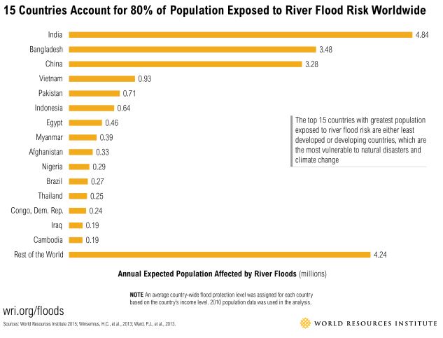 Dans un nouveau rapport, le World Resources Institute et quatre groupes de recherche néerlandais ont estimé que près de 21 millions de personnes dans le monde étaient affectées par des inondations. Ce nombre pourrait augmenter et passer à 54 millions en 2030 à cause du changement climatique et des évolutions socio-économiques.