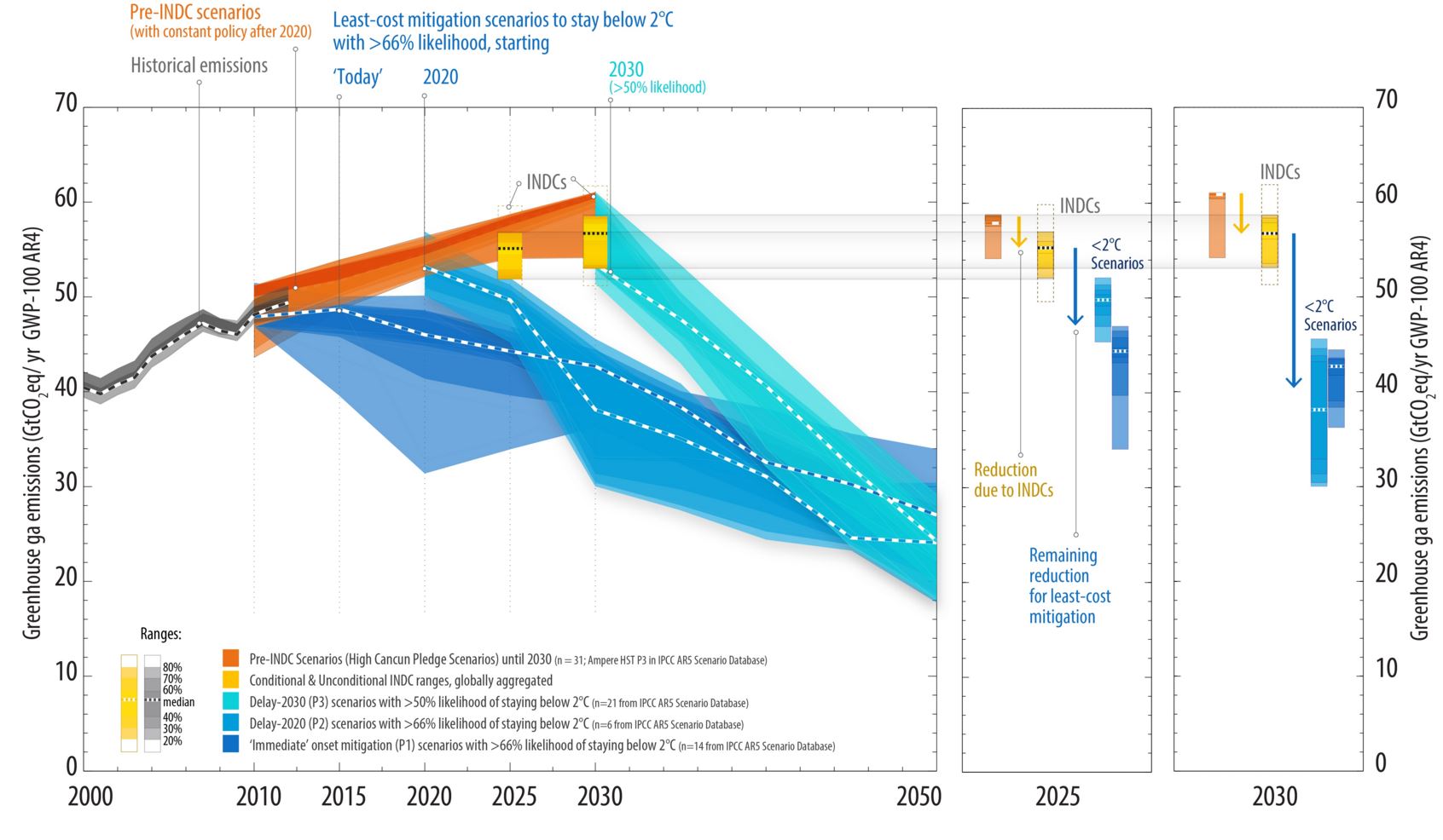 Un rapport de l'ONU indique que les contributions nationales volontaires (INDC) ne permettront, au mieux, que de limiter à 2,7 °C le réchauffement climatique d'ici la fin du siècle. Au moment où ses experts ont commencé à plancher (le 1er octobre dernier) 160 gouvernements avaient publié leurs promesses, soit 75% des parties à la convention à l’origine de 86% des émissions comptabilisées en 2010. D