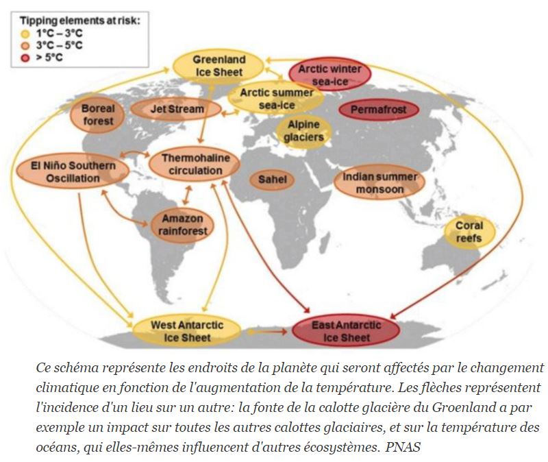 scenario rechauffement 080818Des scientifiques ont calculé un point de rupture qui, s'il est franchi, déclencherait une réaction en chaîne infernale. La pollution due aux énergies fossiles risque de définitivement transformer la planète Bleue en "planète étuve" ou "planète serre", selon des chercheurs internationaux, qui lancent l'alerte dans un rapport publié lundi dans la revue américaine Proceedings of the National Academy of Sciences (PNAS).