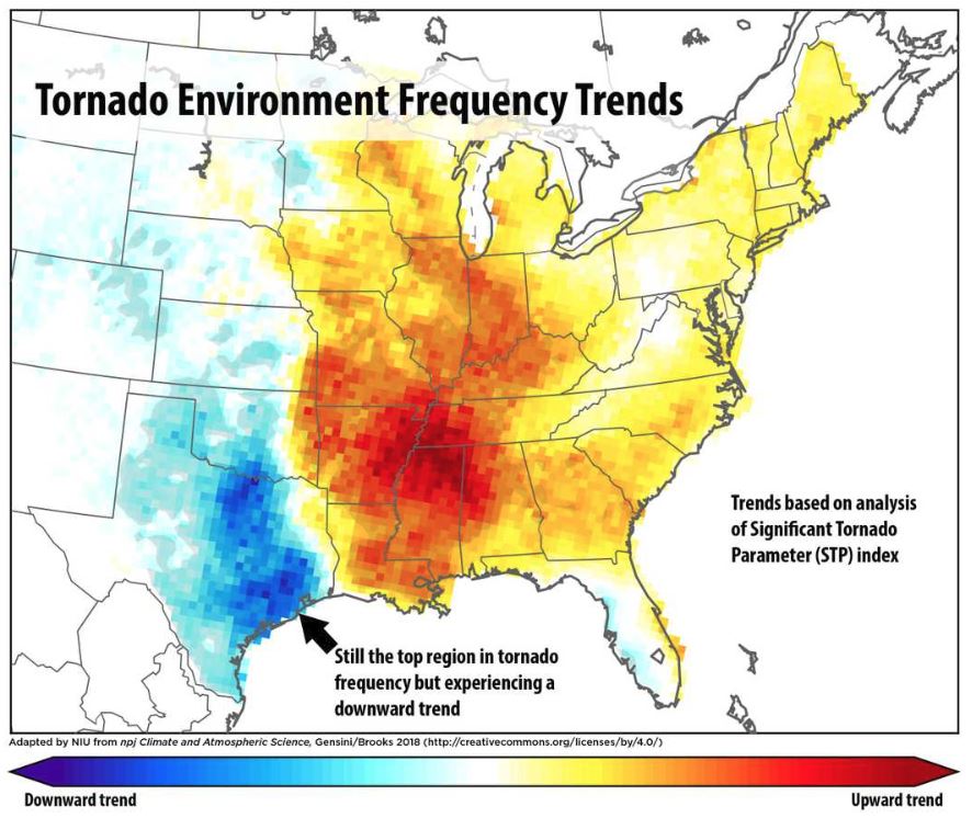 Une nouvelle étude montre qu'au cours des dernières décennies, les tornades ont évolué. Elles ont diminué dans l'Oklahoma, au Texas et au Kansas, mais se sont multipliées dans les États situés le long du Mississippi et plus à l'est. Les scientifiques ne savent pas trop pourquoi. Au total, environ 1 200 tornades frappent le pays chaque année, a déclaré le Laboratoire national des tempêtes violentes.