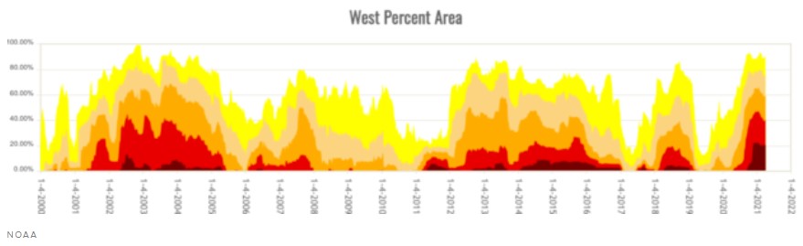 Certains scientifiques affirment que l'Ouest des USA est au bord d'une sécheresse permanente. En effet, en 2000, l'ouest des États-Unis est entré au début de ce que les scientifiques appellent une méga - sécheresse - la deuxième pire en 1200 ans - déclenchée par une combinaison d'un cycle sec naturel et d'un changement climatique causé par l'homme .
