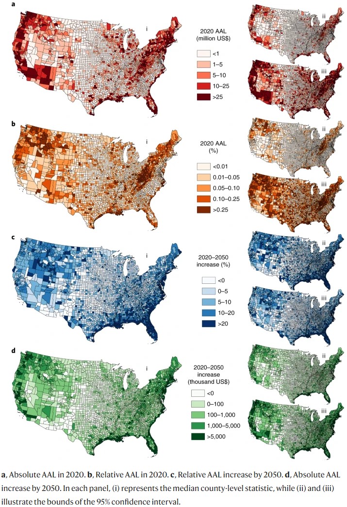 Selon une nouvelle étude publiée dans la revue Nature Climate Change le changement climatique est en passe d'augmenter le coût annuel des dommages causés par les inondations aux États-Unis de plus de 25% d'ici 2050, qui avertit que les communautés défavorisées supporteront probablement le poids du fardeau financier.