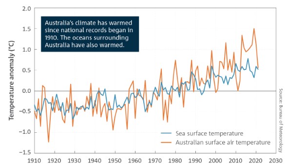 Le réchauffement du climat australien a été d'environ 1,47 degrés Celsius au cours du siècle dernier, selon un nouveau rapport du gouvernement, entraînant des incendies plus importants et plus fréquents, des précipitations plus abondantes et des crues soudaines, ainsi qu'une augmentation lors d'événements de blanchissement massif des coraux.