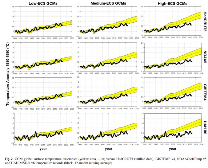 Une étude récemment publiée dans la revue Climate Dynamics par le professeur Nicola Scafetta, un physicien de l'Université de Naples portant sur la précision des modèles climatiques a révélé que presque toutes les prévisions de température passées entre 1980 et 2021 étaient excessives par rapport aux mesures précises des satellites.