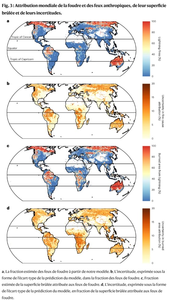 Les incendies peuvent être allumés par des personnes ou par des causes naturelles, qui sont presque exclusivement des coups de foudre. Il est primordial de faire la distinction entre la foudre et les incendies anthropiques lorsqu’il s’agit d’estimer les impacts de l’évolution des conditions socioéconomiques et climatologiques sur l’activité des incendies.