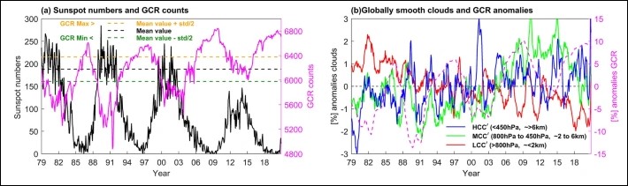 Une étude publiée dans la revue Nature en mars 2023 indique que l'influence de l'ionisation des rayons cosmiques galactiques (GCR) sur la répartition mondiale des nuages est étudiée sur 42 ans
