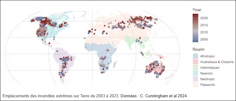 Selon une étude publiée dans la revue Nature Ecology and Evolution, les incendies extrêmes seraient en augmentation entre 2003 et 2023 les 7 dernières années comprenant les 6 années les plus extrêmes.