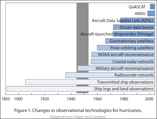 Depuis le 19e siècle, la façon dont nous observons, surveillons et mesurons les ouragans a changé de manière incroyable, comme l'ont résumé Hagen et Landsea dans une étude publiée dans la revue de l'American Meteorological Society. Or, ces évolutions ont eu des impacts directs significatifs sur la détection et la qualification des ouragans qui ne sont pas sans conséquences
