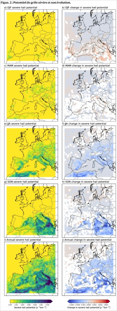 L'analyse de l'équipe montre que la possibilité de très gros grêlons diminue autour de l'Europe centrale et qu'elle reste faible sur les îles britanniques et les zones terrestres de l'Europe du Nord. En revanche, il augmente en Europe du Sud en automne et en hiver, équilibrant les diminutions en été et au printemps.