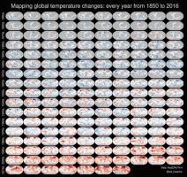 Après la spirale infernale du réchauffement climatique, son créateur, Ed Hawkins, climatologue au centre national pour les sciences atmosphériques de l’Université de Reading en Grande Bretagne, revient avec 167 cartes, afin de montrer ce triste phénomène. Une image vaut décidément mieux que mille mots…