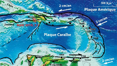 La Guadeloupe, Saint-Martin, Saint-Barthélémy, et la Martinique sont situées sur la frontière entre la plaque Amérique et la plaque Caraïbe et sont donc très exposées à des séismes de fortes magnitudes.
