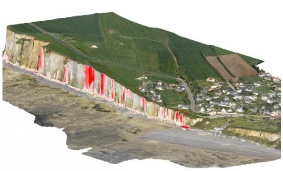 Comme l’a montré à nouveau un éboulement survenu le mois dernier à Varangeville (76), les falaises normandes reculent, à raison de 15 à 20 cm par an en moyenne, mais par écailles pouvant atteindre une dizaine de mètres d’épaisseur en un seul tenant. Sur une portion de falaise de 1500 m particulièrement étudiée en termes de recherche, près de Mesnil-Val, on estime que l’équivalent de 75 briques de lait tombe chaque jour, l’équivalent d’une baignoire tous les trois jours (300 l), et l’équivalent de l’Arc de Triomphe tous les 5 ans (50 000 m3).