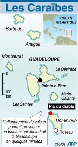 Selon une étude de l'université britannique de Portsmouth publiée dans la lettere d'information de l'American Geophysical Union, l'effondrement d'un volcan sur l'île de la Dominique dans les Caraïbes provoquerait un tsunami qui atteindrait en quelques minutes les côtes densément peuplées de la Guadeloupe située à proximité.