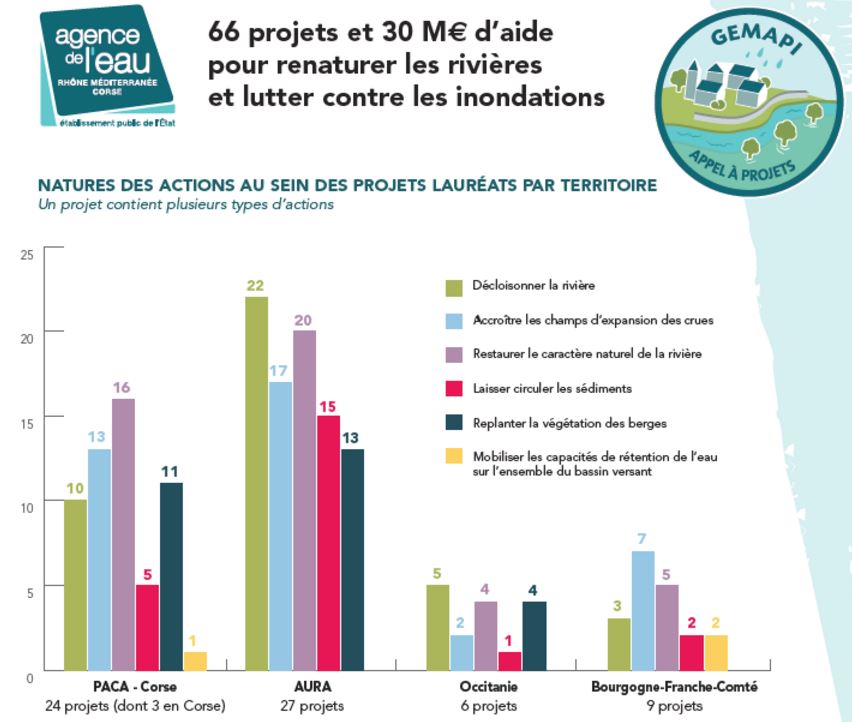 L’appel à projets de l’Agence de l’eau Rhône Méditerranée Corse visant à financer des actions innovantes de renaturation des rivières et de lutte contre les inondations s’est clôturé en juin 2016. Majoritairement portés par les syndicats de rivière, communautés de communes, agglomérations et métropoles, 66 projets ont été sélectionnés pour un montant d’aide de 30 millions d’euros.